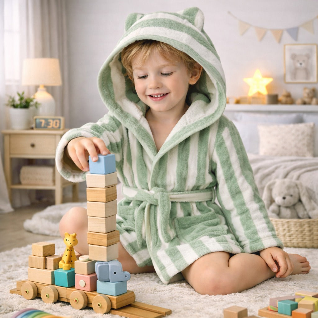 Soft, absorbent cotton kids bathrobe with an attached hood for extra warmth and quick hair drying. Lightweight, breathable, and comfortable for everyday use at home, beach, or pool.