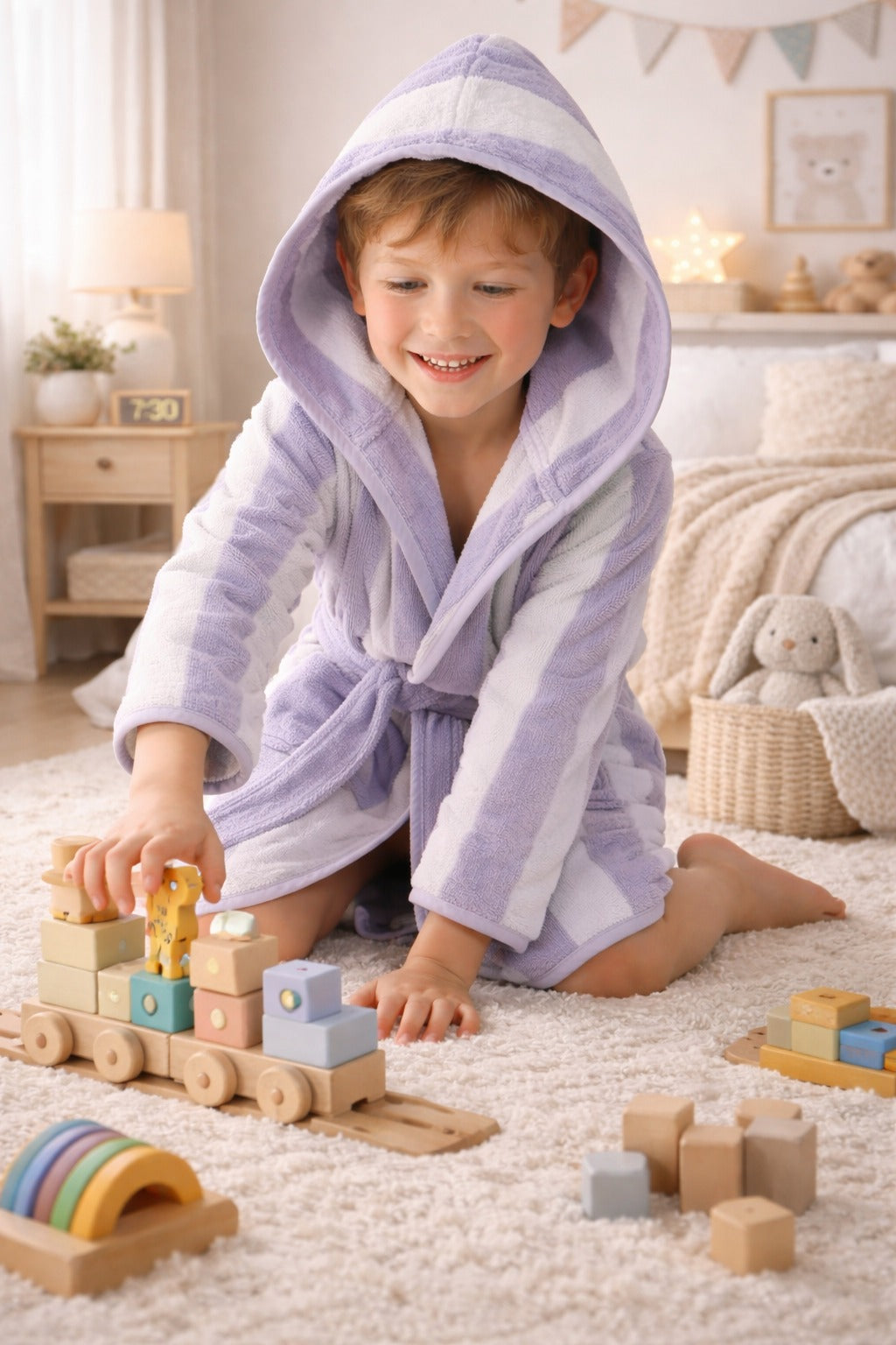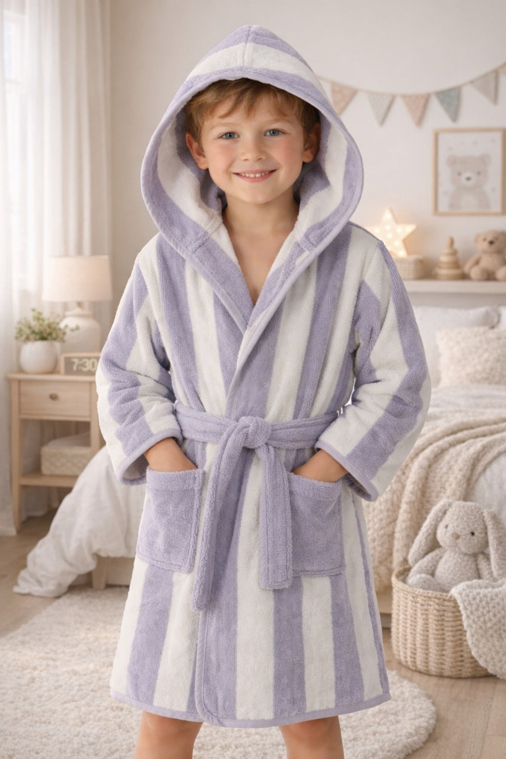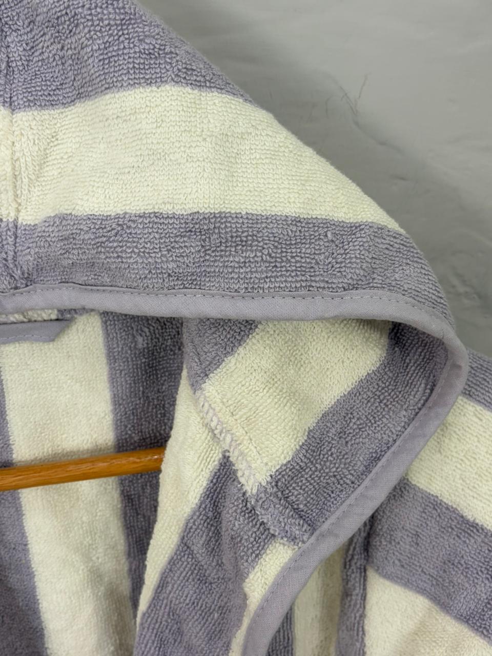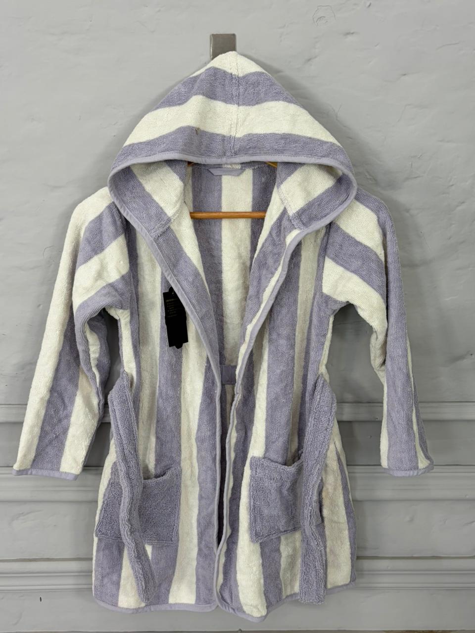 Soft, absorbent cotton kids bathrobe with an attached hood for extra warmth and quick hair drying. Lightweight, breathable, and comfortable for everyday use at home, beach, or pool.